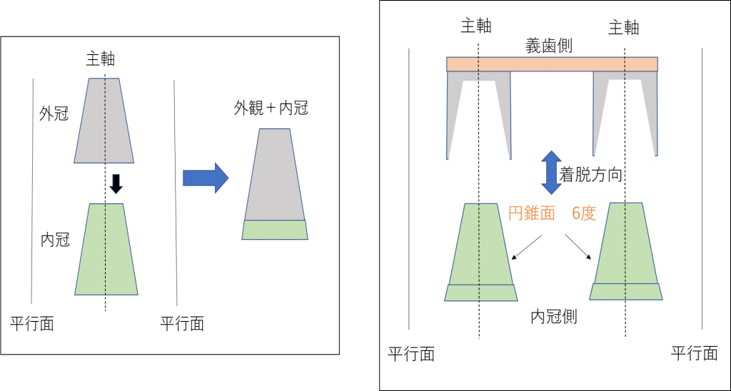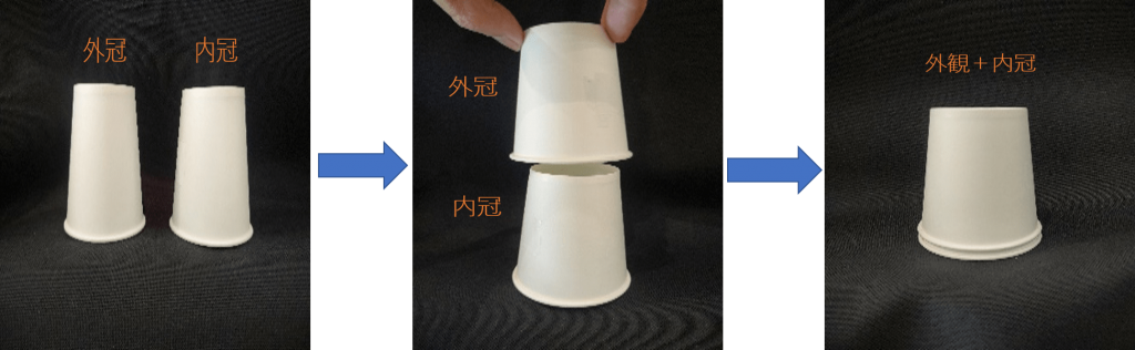 上記のような内冠と外冠の嵌合力により維持力を発揮しますので、セメント等による接着は行いません。